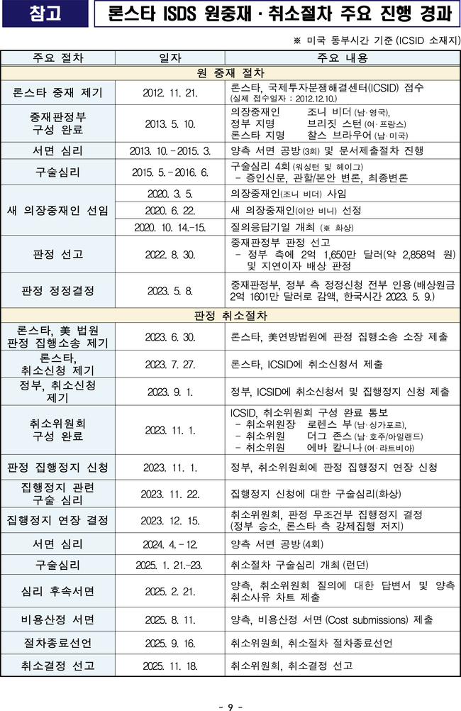 이어 “그 직전인 11월 21일(미국 동부 시간) 론스타 측은 미국 연방법원에 2년 전(2023년 6월) 제기했던 판정 집행소송도 자진 취하해 이것 역시 완전히 종결됐다”며 “이 집행소송은 론스타 측이 원 중재에서 일부 승소한 후인 2023년 6월경 원 판정에서 인정된 배상금 약 2억1650만 달러를 집행하기 위해 제기한 것으로 한국 정부는 2023년 9월경 이 사건 취소위원회에 ‘배상금 일부 지급보증 등의 조건 없이, 취소절차가 종료될 때까지 원 판정의 집행이 정지돼야 한다’고 강력하게 주장해 이에 대한 구술심리 등 치열한 공방 끝에 2023년 12월 집행정지 신청을 무조건부로 인용받아 취소절차가 진행되는 동안 론스타 측의 원 판정 강제집행 시도를 저지했다”고 설명했다.