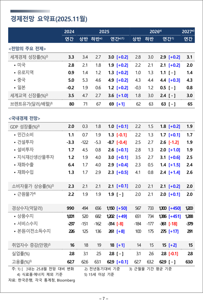 한국은행은 27일 ‘경제전망Indigo Book’(2025년 11월) 보도자료를 발표해 올해 경제성장률 전망치를 올 8월의 0.9%에서 1%로, 내년은 1.6%에서 1.8%로 상향했다.