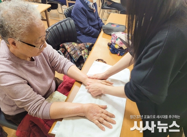 봉사단은 섬세한 손길로 어르신들의 지친 피부와 두피를 정성껏 보살폈으며, 특히 따뜻한 손 마사지로 어르신들의 혈액 순환을 돕고 정서적 교감을 나눴다.