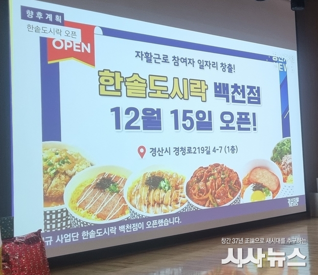 [시사뉴스 장시목 기자]경북경산지역자활센터(센터장 손석기)는 15일 지역 주민의 자립과 경제활동 참여 기회 확대를 위하여 신규 자활근로사업단 「한솥도시락 경산 백천점」을 오픈했다.
