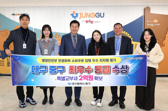 [시사뉴스 이성동 기자] 대구 중구(구청장 류규하)는 행정안전부가 실시한 ‘2025년 민생회복 소비쿠폰 집행 우수 지자체 평가’에서 최우수 등급인 ‘가’ 등급을 받아 특별교부세 2억 원의 재정 인센티브를 확보했다고 16일 밝혔다.