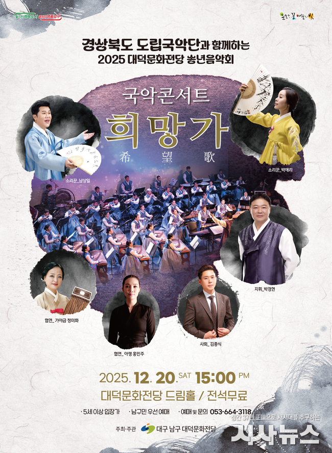 [시사뉴스 장시목 기자]대구 남구 대덕문화전당이 2025년 을사년의 마지막을 경북도립국악단과 함께하는 송년음악회 「국악콘서트_희망가」로 장식한다.