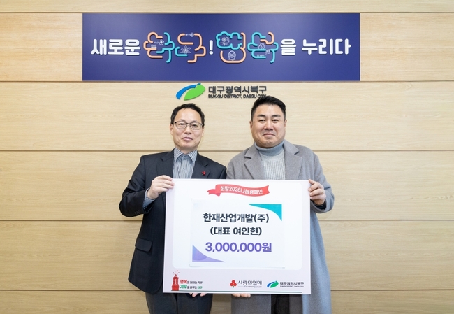 한편, 한재산업개발㈜은 철근·콘크리트 공사를 전문으로 하는 건설업체로, 올해 1월에도 북구청에 성금 300만 원을 기부하는 등 2020년부터 대구 및 고성군 일원에서 후원금 전달과 사회복지시설 봉사활동에 참여하며 지역사회를 위한 지속적인 나눔을 실천하고 있다.