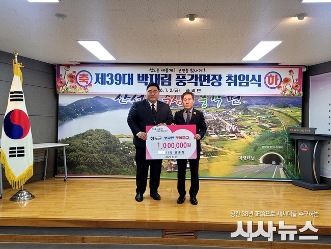[시사뉴스 장시목 기자]청도군(군수 김하수) 풍각면은 지난 2일 풍각면 지역사회보장협의체 위원 김길두씨가 200만원, 경북농약사 변종희씨가 100만원을 풍각면 행복금고에 기부했다고 밝혔다.