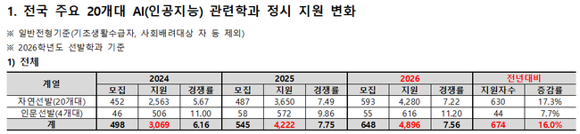 [시사뉴스 홍경의 기자] 2026학년도 인공지능(AI) 관련학과 주요 20개 대학의 정시 지원자수가 전년 대비 16.% 증가한 것으로 나타났다. 계열별로 자연계 선발학과는17.3%, 인문계 선발학과는 7.7% 로 모두 증가했다.
