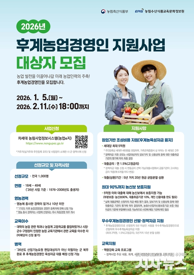[시사뉴스 장시목 기자]영주시는 지역 농업의 고령화와 인력 감소에 대응하고, 안정적인 농업 경영 기반을 갖춘 전문 농업인을 육성하기 위해 ‘2026년 후계농업경영인 육성사업’ 대상자를 모집한다.