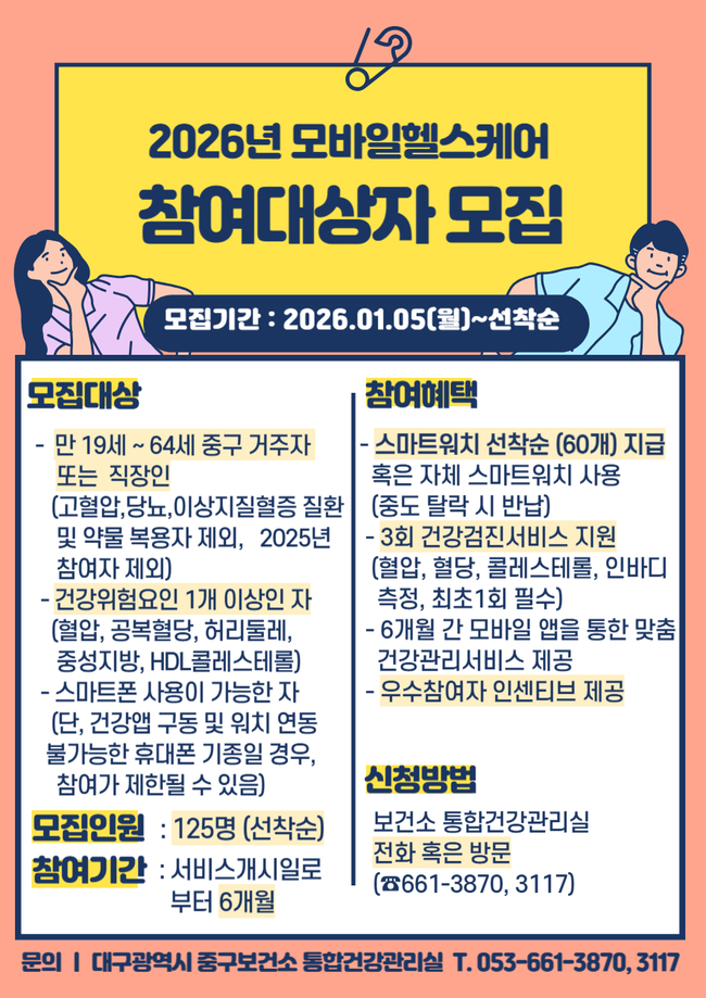 [시사뉴스 이성동 기자] 대구 중구(구청장 류규하)는 스마트폰과 활동량계를 활용해 개인 맞춤형 건강관리를 지원하는 ‘2026년 모바일 헬스케어 사업’ 참여자 125명을 선착순으로 모집한다.