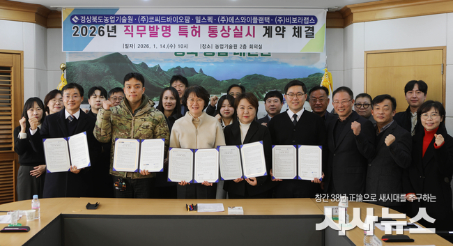 [시사뉴스 하정수 기자] 경상북도농업기술원은 자체 개발한 직무발명 특허의 산업화를 위해 14일 기술이전 대상 업체 관계자들이 참석한 가운데 총 5건의 직무발명 특허 통상 실시 계약을 체결했다.