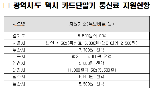 경기도는 31개 시·군 개인·법인택시 전체 택시를 지원대상으로 하며, 카드단말기 1대당 통신료 ‘5,500원/월’의 ‘80%’를 지원하고 있다.