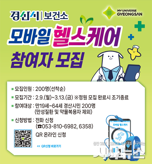 [시사뉴스 장시목 기자]경산시(시장 조현일)는 ICT 기술을 활용해 시민의 생활 습관을 개선하는‘2026년 모바일 헬스케어 사업’ 참여자 200명을 오는 9일부터 모집한다고 밝혔다.