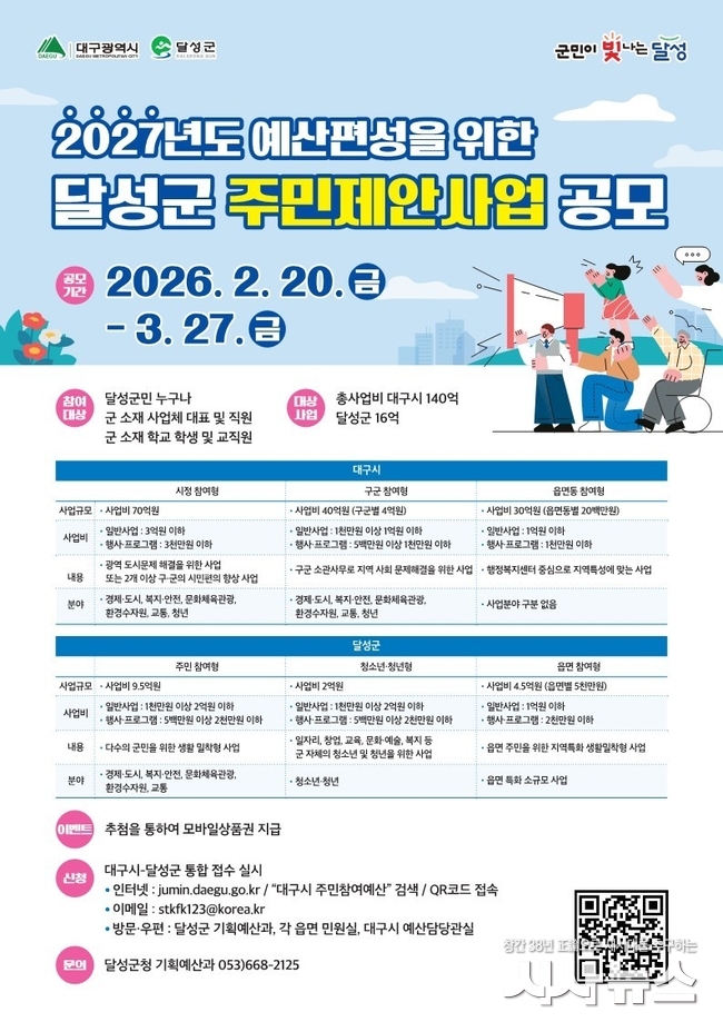 대구 달성군(군수 최재훈)은 2026년 주민제안사업을 2월 20일부터 3월 27일까지 공모한다고 밝혔다.