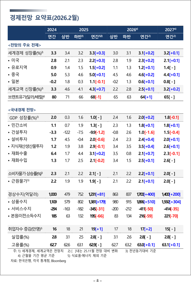 한국은행은 “금년 성장률은 미국 관세 영향과 건설투자의 더딘 회복에도 불구하고 반도체 경기 개선세 확대, 예상보다 양호한 세계경제 흐름 등에 힘입어 지난해 11월 전망수준보다 높은 2%를 나타낼 것으로 예상된다”고 밝혔다.