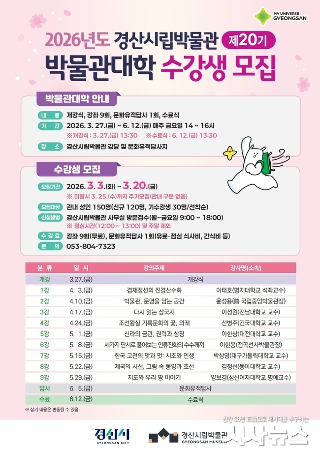 [시사뉴스 장시목 기자] 경산시립박물관은 올해 스무 돌을 맞이한 「제20기 박물관대학」의 수강생을 모집한다고 밝혔다.