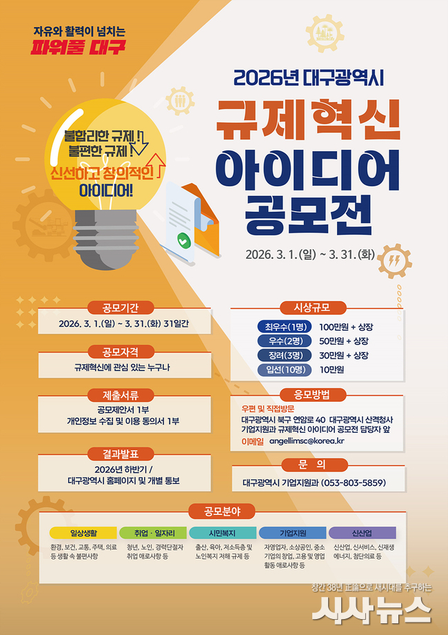 [시사뉴스 하정수 기자] 대구광역시는 시민과 기업이 일상에서 겪는 불합리한 규제를 개선하고, 민생 안정과 지역경제 활력 제고를 위해 ‘2026년 대구광역시 규제혁신 아이디어 공모전’을 개최한다.