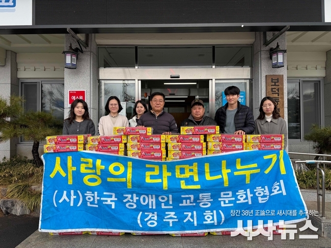 [시사뉴스 하정수 기자] (사)한국장애인교통문화협회 경주지회(총무 김현규)는 2026년 3월 3일(화) 보덕동행정복지센터를 방문해 ‘사랑의 라면 나누기’를 구호로 하여, 취약 계층에게 전달할 라면 80박스(약 50만원 상당)를 기탁했다.