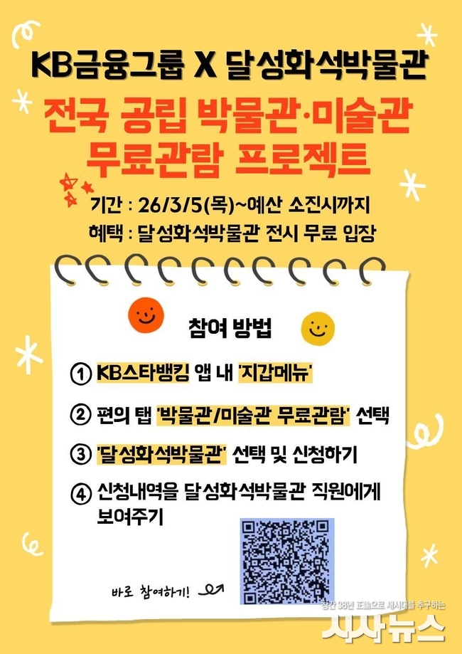 [시사뉴스 이성동 기자] 대구 달성화석박물관이 문화체육관광부와 KB국민은행, 한국박물관협회가 공동 추진하는 ‘KB×전국 공립 박물관·미술관 무료 관람 프로젝트’에 최종 선정됐다. 문화 접근성 격차를 줄이고 국민의 문화 향유 기회를 확대하기 위해 마련된 공익사업으로, 달성화석박물관은 화석·자연사 분야의 전문성과 지역사회 기여도를 인정받아 지원 대상에 이름을 올렸다.