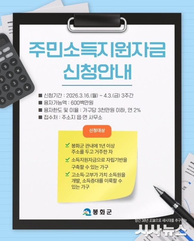 [시사뉴스 장시목 기자]경북 봉화군이 지역 경제의 근간인 소상공인과 농업인의 경영 안정을 돕기 위해 3월 16일부터 4월 3일까지 ‘2026년 주민소득지원사업’ 융자 지원 신청을 받는다.