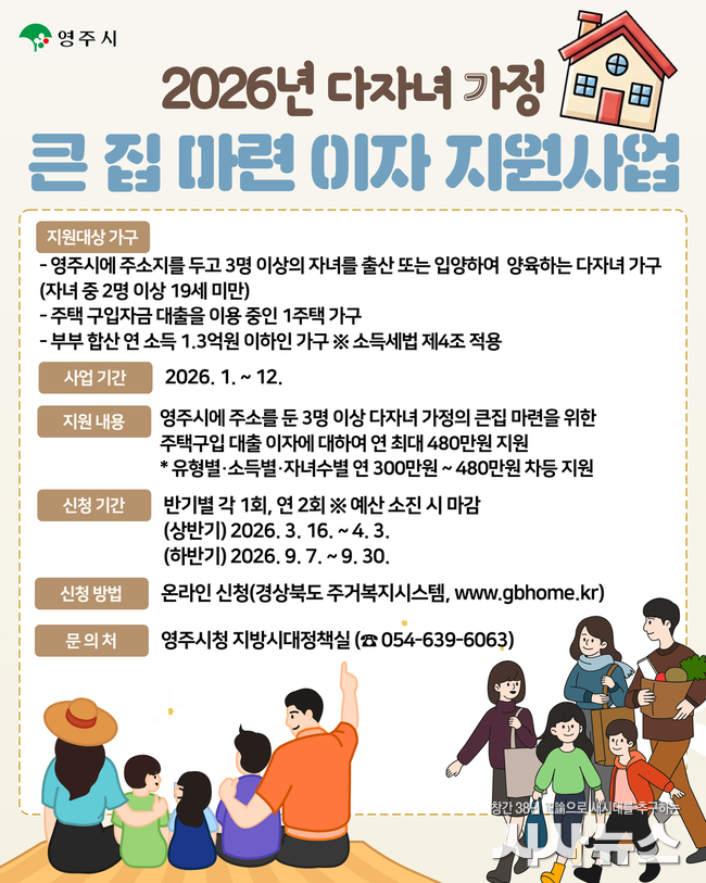 [시사뉴스 장시목 기자]영주시는 관내 3자녀 이상 다자녀가구의 주택 구입 자금 대출이자를 지원하는 ‘2026년 다자녀가정 큰 집 마련 이자 지원사업’ 신청을 3월 16일부터 4월 3일까지 접수한다고 밝혔다.