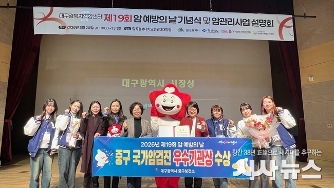 [시사뉴스 이성동 기자] 대구 중구보건소(소장 황석선)는 지난 20일 대구․경북 지역암센터에서 열린 제19회 암 예방의 날 기념식에서 국가암검진사업 유공 기관 평가 ‘우수 기관상’을 수상했다.