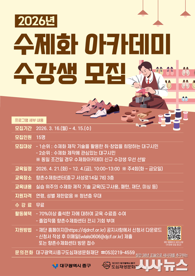 [시사뉴스 이성동 기자] 대구 중구(구청장 류규하)는 오는 4월 15일까지 수제화 산업 전문 인력 양성을 위한 ‘2026년 수제화 아카데미’ 수강생을 모집한다.