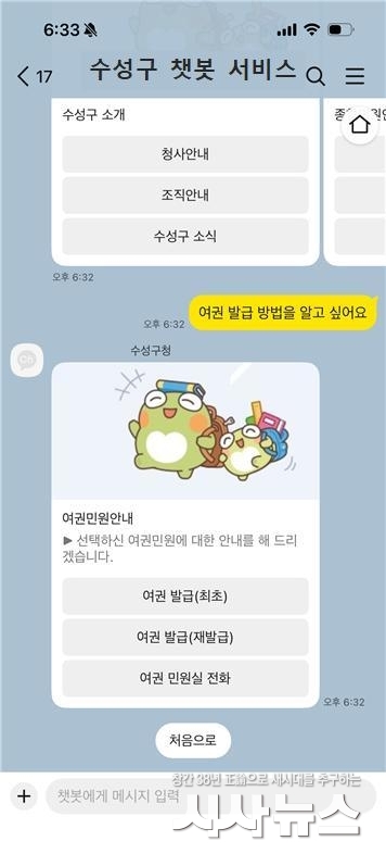 [시사뉴스 이성동 기자] 대구 수성구가 구민들이 시간과 장소에 구애받지 않고 행정 서비스를 이용할 수 있도록 ‘카카오톡 기반 스마트 민원 챗봇’ 구축 사업을 추진한다고 밝혔다.