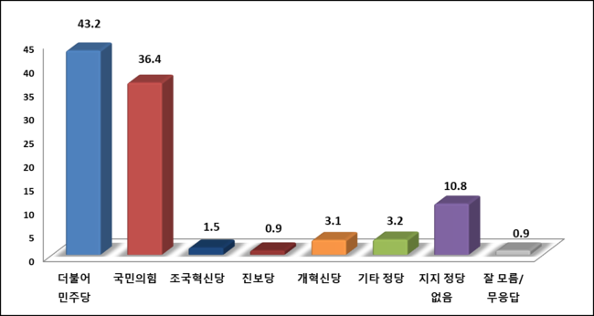 여론조사기관 ㈜모노커뮤니케이션즈/모노리서치가 뉴스나인코리아 의뢰로 지난 3월 27일부터 28일까지 송파구 거주 만 18세 이상 남녀 502명을 대상으로 실시한 조사 결과, 정당지지도에서 더불어민주당이 43.2%를 기록하며 36.4%에 그친 국민의힘을 6.8%p 차이로 앞선 것으로 나타났다.