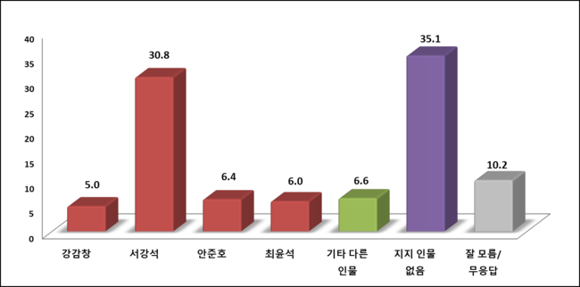 국민의힘은 서강석 예비후보가 30.8%, 안준호 6.4%, 최윤석 6.0%, 강감창 5.0%로 나타났다.