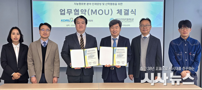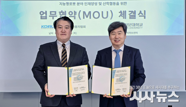 [시사뉴스 장시목 기자]대구 영진전문대학교 지능형로봇 혁신융합대학사업단(사업단장 안상욱)은 로봇 및 AI 산업 환경 변화에 대응한 실무형 인재 양성을 위해 지난 2일 한국로봇리퍼브센터(한국로봇사용자협회 산하)와 산학협력 협약(MOU)을 체결했다.