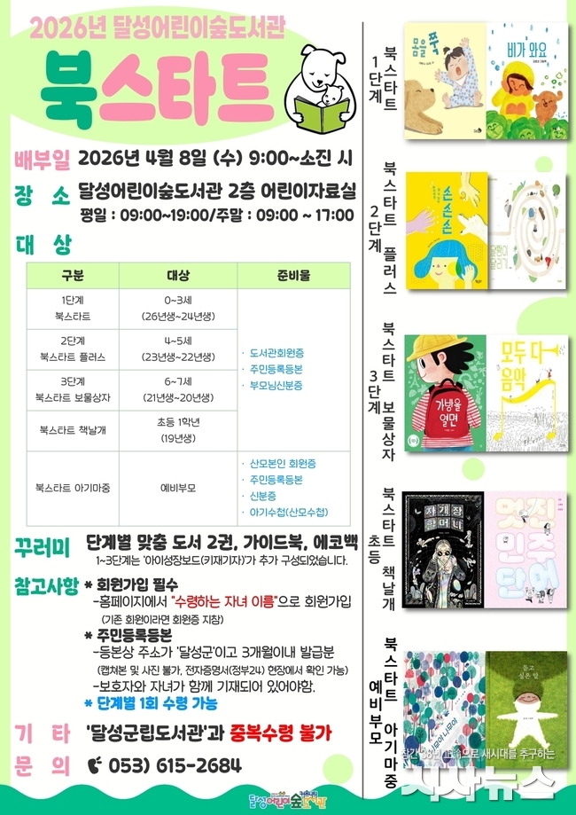 책꾸러미는 각 연령대의 발달 특성을 고려해 선정한 도서와 가이드북으로 구성됐다. 배부는 8일 오전 9시부터 각 도서관에서 선착순으로 진행되며, 준비된 수량이 소진될 때까지 이어진다. 달성군에 주소를 둔 도서관 회원이라면 누구나 수령 가능하다.