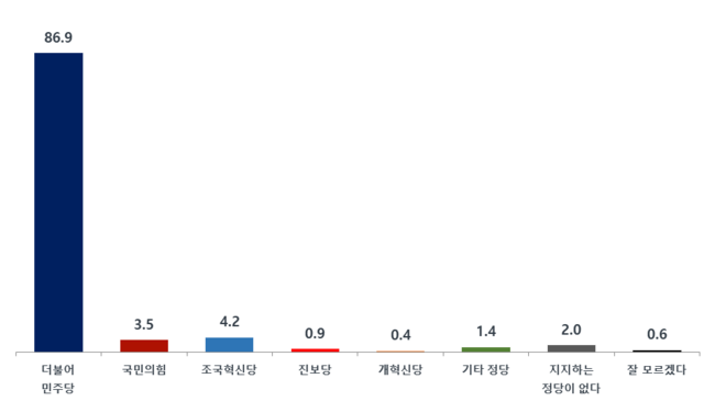 정당지지도는 더불어민주당 지지율이 86.9%로 압도적인 가운데 조국혁신당 4.2%, 국민의힘 3.5%, 진보당 0.9%, 개혁신당 0.4%, 기타 정당 1.4%, 지지하는 정당이 없다 2.0%, 잘 모름 0.6% 순으로 나타났다.