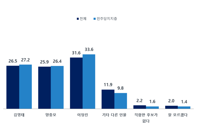 더불어민주당 지지층에서는 이정린 32.2%, 김영태 26.7%, 양충모 23.9%, 김원종 14.0% 였고, 기타 다른 인물 1.1%, 적합한 후보 없다 1.1%, 잘 모름 1.0% 순이었다.
