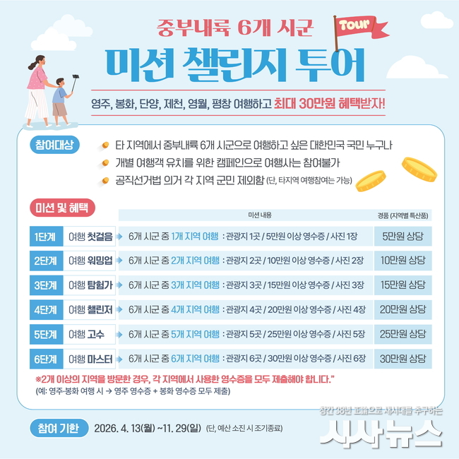 이번 사업은 경상북도·충청북도·강원도 접경 지역 6개 지자체가 공동 추진하는 관광 마케팅 프로그램으로, 여행객이 각 지역 명소를 방문하고 미션을 수행하면 지역 특산물을 경품으로 제공하는 참여형 이벤트다.