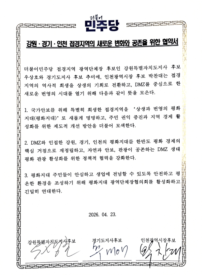 [시사뉴스 이광효 기자] 더불어민주당 우상호 강원특별자치도지사 후보자, 더불어민주당 추미애 경기도지사 후보자, 더불어민주당 박찬대 인천광역시장 후보자가 ‘접경지역의 평화와 번영을 위한 평화지대 공동협약’을 체결했다.