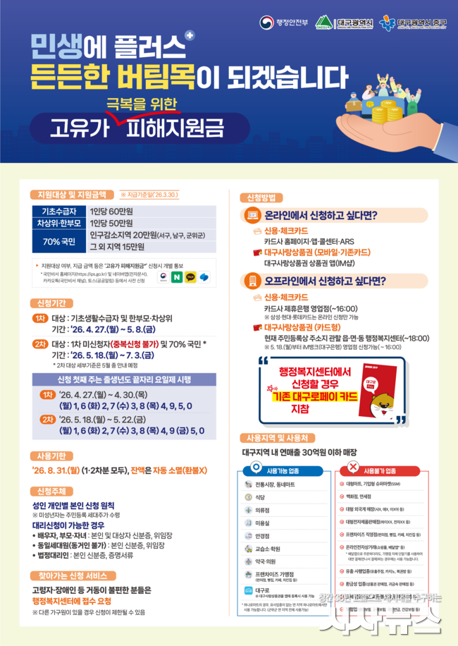[시사뉴스 이성동 기자] 대구 중구는 중동전쟁 발 고유가·고환율·고물가로 인한 구민의 경제적 부담을 덜고 취약계층을 지원하기 위해 ‘고유가 피해지원금’ 신청을 접수한다.