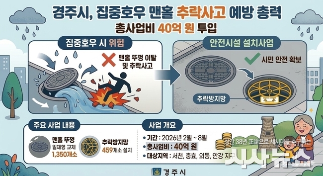 [시사뉴스 하정수 기자] 경주시는 집중호우에 따른 맨홀 추락사고를 예방하기 위해 침수 우려 지역을 중심으로 안전시설 설치사업을 추진한다고 24일 밝혔다.