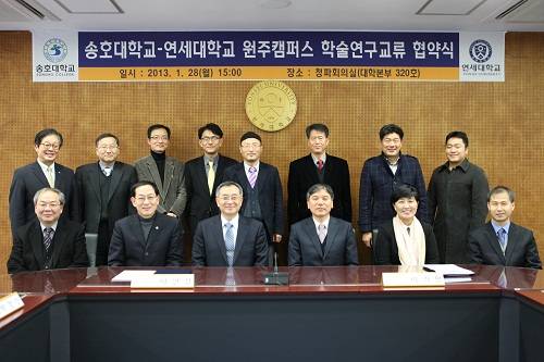 송호대학교(총장 이기평)은 연세대학교 원주캠퍼스(부총장 이인성)와 1월 28일 15시 연세대 원주캠퍼스 청파회의실에서 양 대학교 간의 학술연구교류를 통하여 연구 및 교육의 질을 향상하기 위한 협약을 체결하였다.
