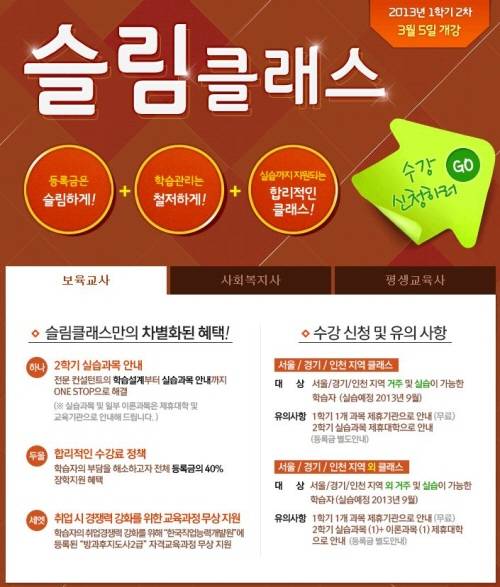교육과학기술부인가 학점은행제 기관인 스스로원격평생교육원은 2013년 1학기 개강에 앞서 보육교사 슬림클래스 과정을 오픈한다.
