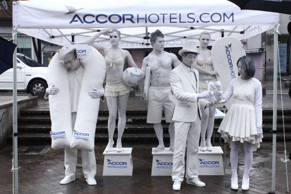 6일 홍대 일대에서는 바디 페인팅을 한 스트리트 아티스트들이 ‘여행’을 주제로 마임 연기를 펼쳐 거리를 지나는 이들의 발길을 붙잡고 있다. 아코르호텔은 행사 현장을 찍어 아코르호텔 페이스북에 올리는 이들에게 즉석에서 경품을 증정한다. 페이스북에 현장 사진을 올린 사람들 중 추첨을 통해서 호텔 시식권 및 숙박권을 제공한다.