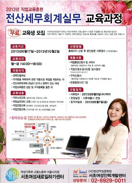 서초여성인력개발센터 관계자는 “전산세무회계 분야는 일반기업체를 비롯해 모든 업종에서 반드시 필요한 분야로 유망직종으로 꼽힌다”면서 “이번 국비지원 무료교육은 현장에 바로 투입될 수 있는 실무 중심의 커리큘럼으로 구성된 만큼 전산, 세무, 회계분야 진출을 원하는 경력단절 여성에게 많은 도움이 될 것으로 기대한다”고 말했다.