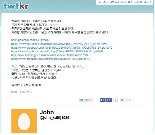 원전반대그룹은 이날 오후 3시7분 트위터를 통해 올린 글에서 “한수원 사이버 대응훈련 아주 완벽하시네”라며“우리 자꾸 자극해서 어쩔라고 ㅋㅋㅋ”라고 비웃었다.