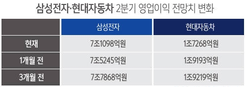 증권사들이 3개월 전에 예상했던 삼성전자의 영업이익 전망치는 7조7868억원, 1개월 전 전망치는 7조5245억원이었다. 실적 발표일이 다가올수록 전망치가 낮아지고 있는 셈이다.