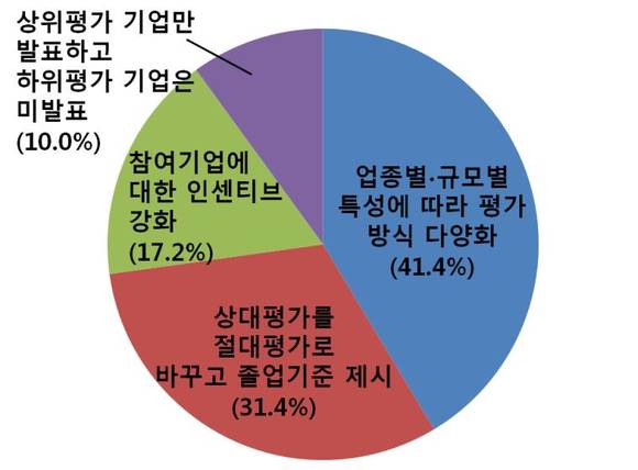 동반성장지수 평가 방식의 보완과제로는 80% 이상이 현행 평가의 산정이나 공표방식에 대한 개선이 필요하다고 지적했다. '업종별·규모별 특성에 따라 평가방식 다양화'(41.4%), '상대평가를 절대평가로 바꾸고 졸업 기준 제시'(31.4%), '상위평가 기업만 발표하고 하위평가 기업은 미발표'(10.0%) 등이다.