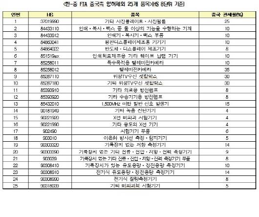 특히 이번 합의로 한·중 FTA에서 중국측이 양허제외한 25개 품목에 대해서도 무세화가 가능해져 중국시장 진출확대에 큰 도움이 될 전망이다.