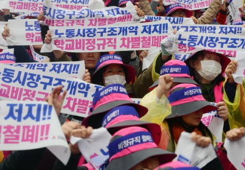 이들은 "대학생들은 지금도 등록금 마련을 위해 거리, 편의점, 공사장, 카페로 힘든 아르바이트에 내몰리고 있다"며 "노동개혁 역시 청년팔이 노동개악에 불과하다. 재벌중심의 기업구조로 청년들은 지속적으로 저임금 비정규직과 파견노동에 시달린다"고 꼬집었다.
