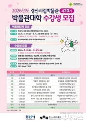 [시사뉴스 장시목 기자] 경산시립박물관은 올해 스무 돌을 맞이한 「제20기 박물관대학」의 수강생을 모집한다고 밝혔다. 이번 박물관대학은 3월 27일부터 6월 12일까지 매주 금요일 오후 2시부터 4시까지 운영되며, 수강생 모집은 3월 3일부터 3월 20일까지 성인 150명을 선착순으로 모집한다. 경산시립박물관 박물관대학은 올해로 스무 돌을 맞이하여 그 의미를 더한다. 강의는 기존 7~8회 운영에서 총 9회의 강좌와 1회의 문화 유적 답사로 확대하여 운영하며, 강의 주제 또한 고고학, 미술사학, 역사학, 인문학 등 다양한 분야를 아우르며 시민들에게 역사와 문화를 입체적으로 이해하는 기회를 제공할 예정이다. 특히 이번에는 단순한 강의 중심 프로그램을 넘어, 우리 지역과 우리나라 문화에 대한 사유의 폭을 넓히는 역사교육 프로그램으로 기획하였다. 이를 통해 시민들은 역사와 문화를 더 친숙하게 체감하고, 문화유산의 가치를 새롭게 인식하는 계기가 될 것으로 보인다. 주요 강의로는 이태호 명지대학교 석좌교수가 진행하는 「겸재 정선의 진경산수화」, 윤성용 전 국립중앙박물관장이 들려주는 「박물관, 문명을 담는 공간」, 이성원 전남대학교 교수의 「다시 읽는 삼국지」, 그리고