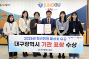 [시사뉴스 이성동 기자] 대구 중구(구청장 류규하)는 ‘2025년 청년정책 활성화 유공’ 분야에서 대구광역시 기관 표창을 받았다고 밝혔다. 대구시는 청년정책 전담 부서를 신설한 2017년 이후, 우수한 청년정책 추진 성과를 거둔 기초자치단체를 대상으로 표창을 수여한다. 대구 중구는 청년 주거 안정과 경제적 부담 경감을 위해 청년 사업자 임대료 지원, 청년 부동산 중개보수 및 이사비 지원 등 지역 정착형 사업을 대구 지역 지자체 최초로 추진해 왔다. 또한 행정안전부 주관 ‘2025년 청년마을 만들기’ 공모사업에 선정돼 청년친화도시 기반을 마련했으며, 청년 소통과 교류의 거점인 중구 청년지원센터 ‘잇플’을 개소해 청년 활동 공간을 확충했다. 이와 함께 ‘중구 청년의 날’ 행사와 청년 팝업 클래스 등 청년 맞춤형 문화 행사를 운영하고, 2030 청년창업지원센터와 북성로 청년창업클러스터를 중심으로 청년 친화형 일자리 환경과 창업 기반을 구축하는 등 다양한 분야에서 청년을 위한 실질적인 정책을 추진했다. 아울러, 중구보건소와 대구행복기숙사 간 ‘청춘 心쿵 프로젝트’ 업무협약을 체결하는 등 청년 건강증진을 위한 정책도 병행 추진해 왔다. 이러한 종합적인 청년정책 추진은