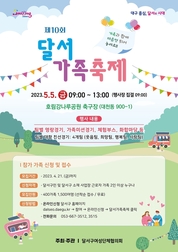 [시사뉴스 박도영 기자] 대구 달서구(구청장 이태훈)는 4월 21일까지 5월 어린이날 및 가정의 달을 맞아 제10회 달서가족축제 참가 가족을 모집한다고 밝혔다. 올해 10회째를 맞는 달서가족축제는 다양한 가족과 이웃이 함께 따뜻한 공동체 문화를 조성하기 위해 마련됐으며, 5월 5일(금) 오전 9시 호림강나루공원 축구장에서 개최된다. 본 축제는 지난해에 이어 달서구여성단체협의회(회장 서삼수) 주관으로 추진된다. 사전에 400가족 1,500여명의 선착순으로 신청을 받아 동별 4개 팀으로 구성해 팀별 대항전으로 운영된다. 신청자격은 달서구민 및 달서구 소재 사업장 근로자 가족 2인 이상이면 누구나 가능하며 4월 21일까지 달서구 홈페이지를 통해 신청하면 된다. 참가비는 무료이다. 주요 행사는 색판뒤집기, 용수철 릴레이, 산넘고 물건너, 하늘높이 슛 등 다양한 체육경기와 참가자 모두 함께하는 팀별 응원전 등으로 진행된다. 가족미션으로는 가족줄넘기, 사랑 옮기기, 만보기, 제로게임, 날아라 고무신 등 16종이 18개 부스에서 진행된다. 홍보 및 체험마당에서는 체성분 측정 및 건강 상담, 스트레스 및 직업흥미 검사, 페이스페인팅 등을 운영한다. 이태훈 달서구청장은 “많