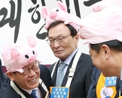 [시사뉴스 김세권 기자] 범여권 인사들이 돼지머리 인형을 쓰고 국회에 등장해 눈길을 끈다. 문희상 국회의장, 이재명 경기지사와 더불어민주당 이해찬, 정의당 심상정 대표 등은 12일 오후 경기도 주최로 국회의원회관 앞 잔디밭에서 열린 ‘2019 국회 우리 한돈 사랑 캠페인’에 참석했다. 이들은 분홍색 돼지머리 인형을 쓰고 ‘한돈’ 글자가 쓰인 주황색 앞치마를 두르고서 등장했다. 문 의장은 “돼지 소비에 우리가 앞장 서야 돼지(되지)?”라고 말해 웃음을 유도했다. 이 대표는 “농가에서 3km 이내에 있는 돼지들은 모두 살처분했기에 유통되지 않는다”며 “유통되는 돼지는 아주 맛있고 편안하게 드셔도 된다”고 말했다. 심 대표는 “돼지 개체수가 줄면 값이 올라야 하는데 지금 또 값이 폭락했다”며 “걱정하지 마시고 돼지고기 많이 드셔서 농가도 힘을 얻고, 돼지농사도 잘 되길 바란다”고 했다. 이 지사는 “시중에 유통되는 돼지들은 병이 있어도 먹는 데는 아무 문제가 없다는 게 검증됐다”며 “아무 지장 없는 돼지고기를 많이 드셔 달라”고 당부했다. 경기도는 파주, 연천, 김포 등 아프리카돼지열병(ASF)의 국내 첫 발생지다. 돼지고기 값이 폭락하면서 농가는 고통을 호소하고