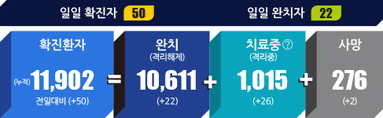 [시사뉴스 이혜은 기자] 질병관리본부 중앙방역대책본부(본부장 정은경)는 6월 10일 0시 현재, 신규 확진자가 50명 발생하여 총 누적 확진자수는 11,902명(해외유입 1,307명*(내국인 86.7%))이라고 밝혔다. 신규 격리해제자는 22명으로 총 10,611명(89.2%)이 격리해제 되어, 현재 1,015명이 격리 중이다. 사망자는 2명이 추가되어 누적 사망자는 276명(치명률 2.32%)이다. * 조사가 완료되어 해외유입으로 확인된 사례