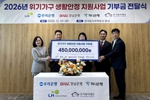 [시사뉴스 김성훈 기자] 한국토지주택공사(LH)는 금융기관 3곳과 함께 퇴거 위기에 놓인 임차인을 위해 총 4억5000만원을 지원한다고 9일 밝혔다. 해당 금융기관은 우리은행과 하나은행, 경남은행이다. 기금은 LH 3억원, 은행 1곳당 5000만원씩 조성했다. 주거복지재단을 통해 LH 임대주택에 거주하면서 실직과 질병, 사고 등 불가피한 사유로 임대료 등을 장기 체납한 임차인을 위해 사용된다. 지원 대상 가구는 주거복지 전문가로 구성된 'LH주거지원위원회'를 통해 선정된다. LH는 지난 2020년부터 다양한 기관과 협업해 생계위기 임차인을 지원해왔다. 이번 기부를 포함한 누적 기부액은 총 22억 1000만원에 달한다. 조경숙 LH 주거복지본부장은 "취약계층의 주거 위기 극복을 위해 앞으로도 다양한 기관과 협업해 지원을 확대해 나가겠다"고 말했다.